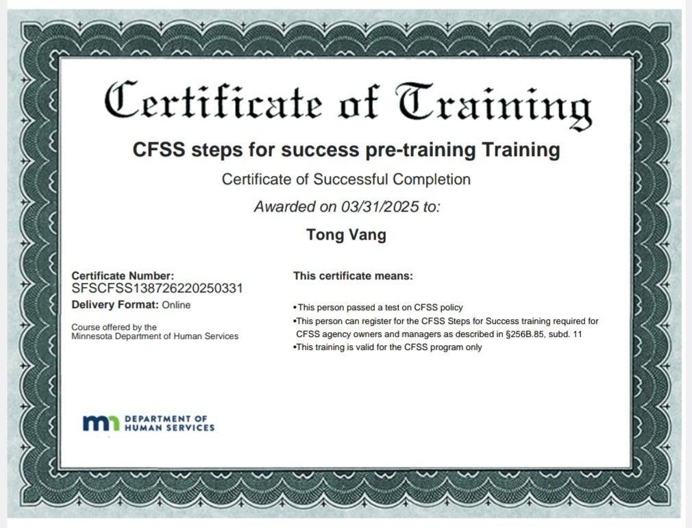 We help families navigate the transition to the new Minnesota Community First Services and Support (CFSS) model. We are trained in person-centered principles, safety protocols, and ethical support, ensuring your loved ones receive care that honors their independence.